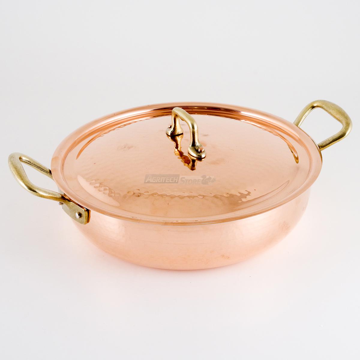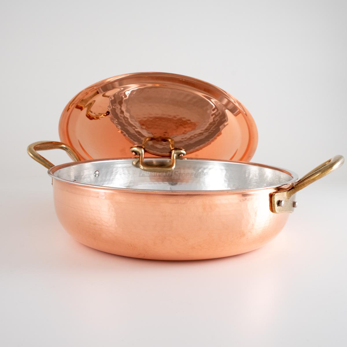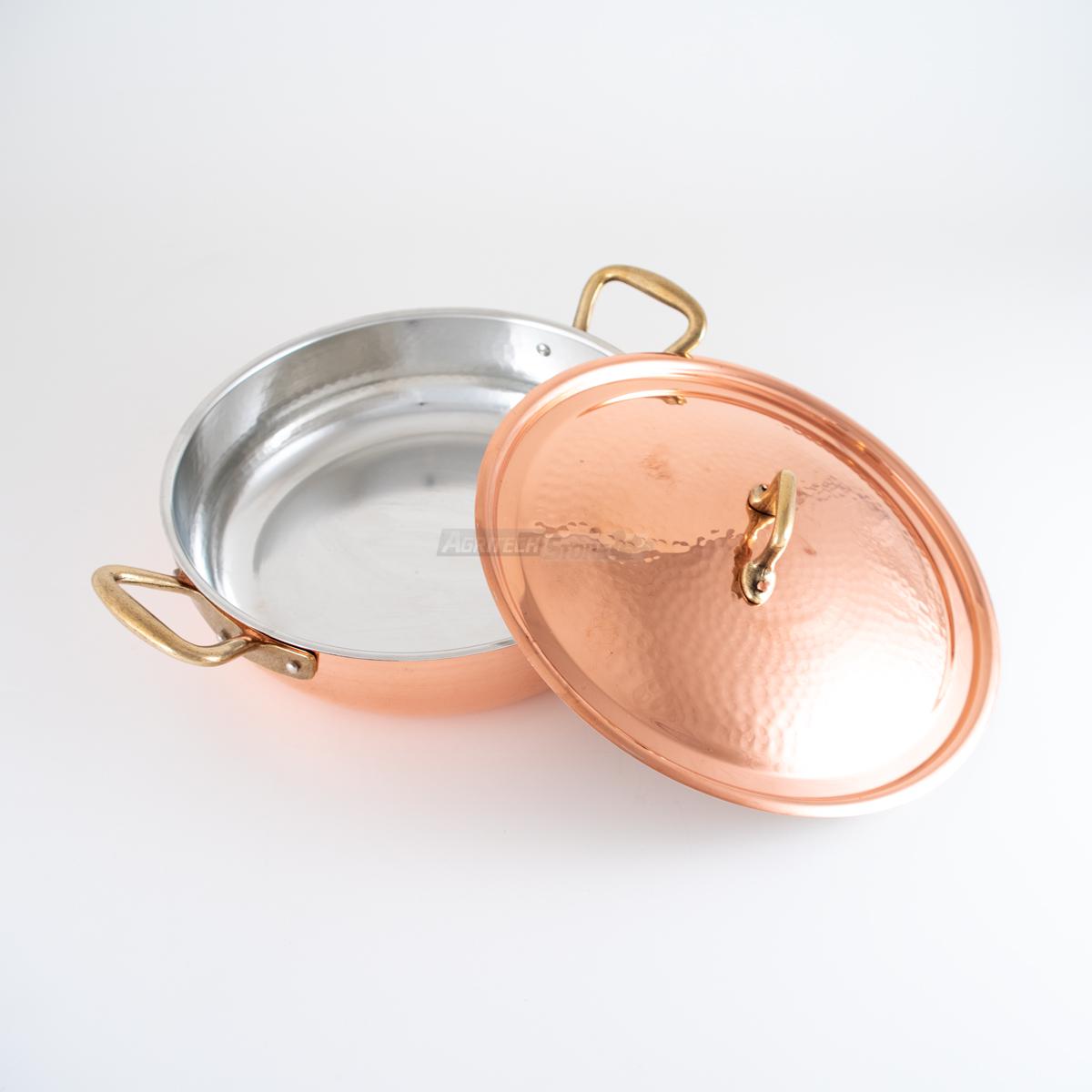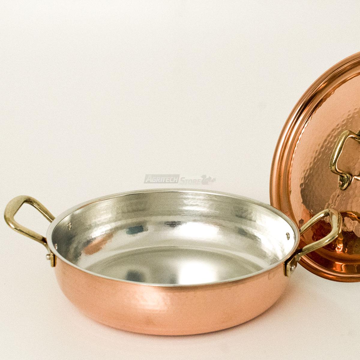 W/m°C) offre la possibilité de cuisiner plus rapidement et plus uniformément que l'acier inoxydable (17 W/m°C) ; de plus, grâce à sa réactivité, il s'adapte parfaitement aux variations thermiques, tant en chauffage qu'en refroidissement, afin de ne pas brûler le contenu. Avec son revêtement étamé vous aurez la possibilité de cuire tout type d'aliments, même les aliments acides, contrairement à une poêle en cuivre non étamée. Le fond spécial convient également à la cuisson à induction ainsi qu'aux plaques à gaz. Convient également au four.