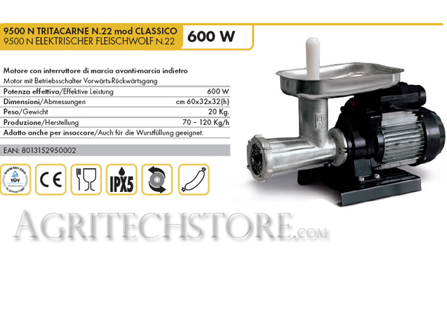 HACHOIR REBER 9500n classique Le hachoir à viande Reber équipé en standard d'une plaque (avec trous de 6 mm pour l'art 9502 N et 9501 N, 8 mm d'autres modèles.); Ils sont disponibles sur demande à partir de plaques mm avec des trous.4,5 - 6 - 8 - 10 - 12 - 14 - 16 - 18 - 20(seulement jusqu'à mm.16 pour hachoir à viande Classé n ° 5). Classé n ° 22 Classé n ° 32 et pour la viande des plaques de broyeur et de couteaux sont disponibles en acier inoxydable. Ils sont également disponibles pour entonnoirs saucisses et de remplissage (pour maintenir en place l'hélice du hachoir à viande tout en faisant les saucisses).