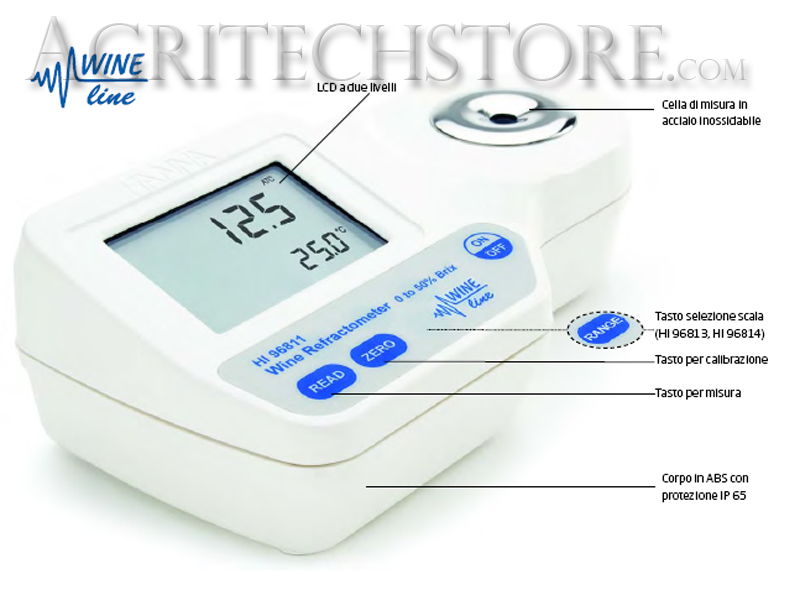 Il est d'instruments optiques qui utilisent la mesure de l'indice de réfraction pour déterminer la teneur en sucre (Brix%) de solutions aqueuses, avec un procédé simple et rapide. Après un étalonnage facile de l'utilisateur avec de l'eau distillée ou désionisée, en quelques secondes, l'instrument mesure l'indice de réfraction de l'échantillon et la convertit en unités Brix% de concentration.